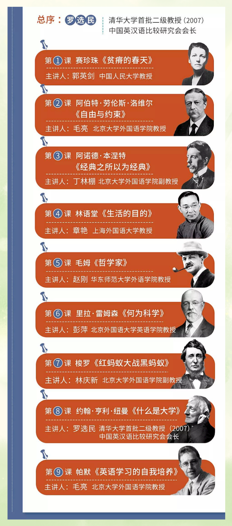 ▲图:杨振宁 / 《九零后》而那本影响了联大所有大一新生的大一英文课本,看似普通,其实并不简单。正如北京师范大学渠敬东教授所言:“教育的本质是重复和传递。”为了让好的教育得到传承,中译出版社将这本尘封已久的英文课本发掘了出来,并邀请多位名校教授共同将其翻译为英汉双语读本,重新取名《西南联大英文课》并出版。《西南联大英文课》一经推出便广受好评,豆瓣评分高达9.5分。不少读者第一时间买来了纸质书阅读,期盼能够感受西南联大英文课的魅力,甚至认真写下阅读笔记。可是,也有读者反馈说,自学这些课文难度还是太大,总有一些似懂非懂的地方,如果有人能够答疑解惑,就再好不过了。为了满足大家对于《西南联大英文课》的学习热情与深度探究的求知欲,三联中读和中译出版社还精心策划:在《西南联大英文课》纸质书的基础上,邀请到了8位国内一流名校的英文教授。他们将作为阅读导师,亲自为你讲解西南联大的英文课本。如果你也想穿越时空,走进西南联大的英文课堂,就一定不能错过这套值得反复阅读、聆听,和收藏的《西南联大英文课》书课礼盒。· 8册口袋书(英文课文+中文译文)