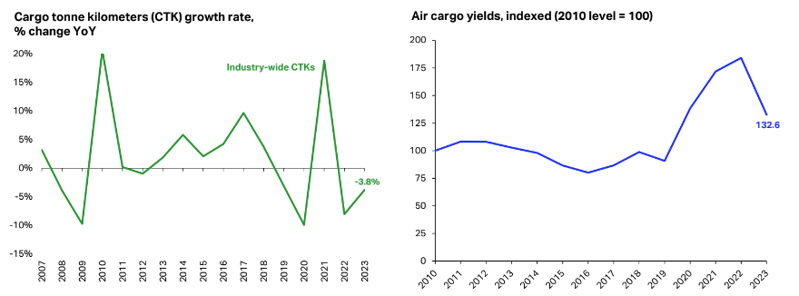 随着客运业务的复苏,航空货运在整个航空业总收入中的份额已从2021年的40%高位回落至2023年的18%。尽管如此,这仍高于疫情前约10%至12%的平均水平。