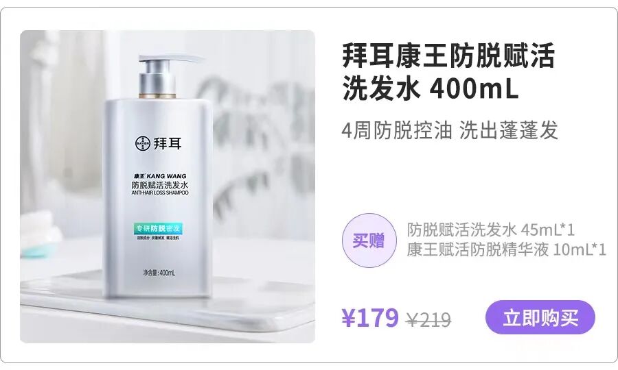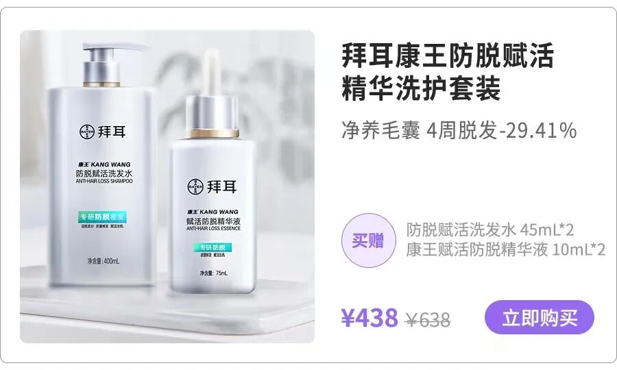 这套拜耳康王的赋活防脱洗护套组复推,品牌方也是诚意满满,给到我们研究所粉丝专属优惠,力度超划算哦!