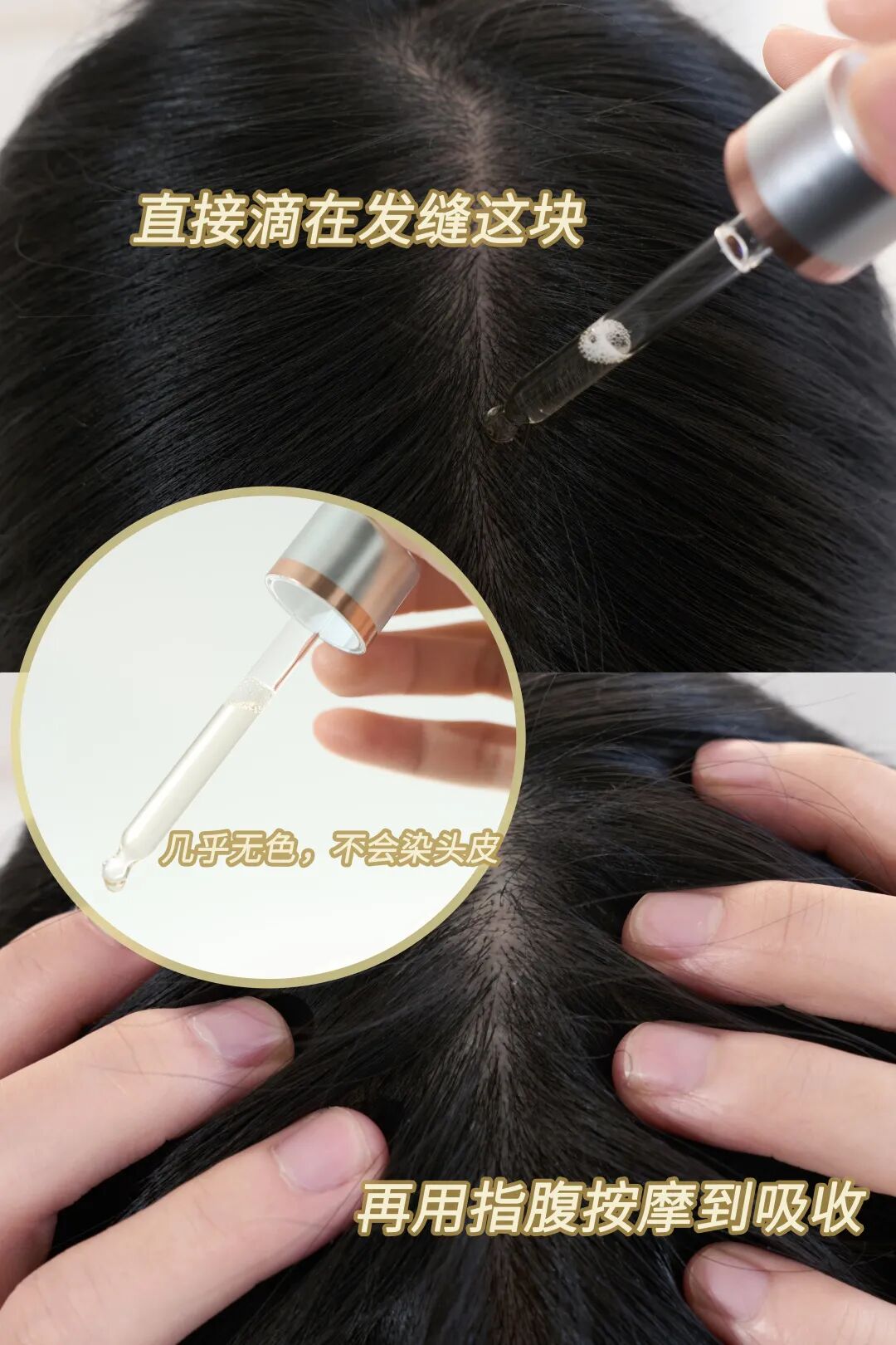 使用方法也很简单,只需要在洗完头,头皮干后,用滴管吸取精华液,滴落在头皮上,然后按摩头皮 3~5 分钟,让精华液充分浸润头皮,更有利于毛囊吸收养分。