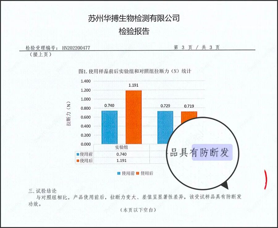 也就是说,使用后头发更强韧了,要用更大力气才能拉断。