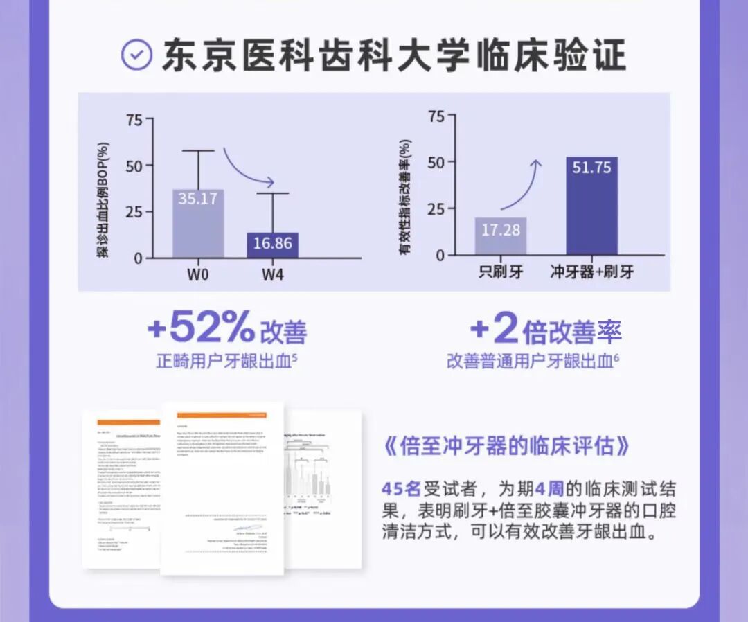 根据东京医科齿科大学《倍至冲牙器的临床评估》,在实验条件下(使用标准喷头)45 名受试者(其中 15 名为正畸用户)使用倍至胶囊冲牙器 4 周,牙龈出血的情况都有显著改善。