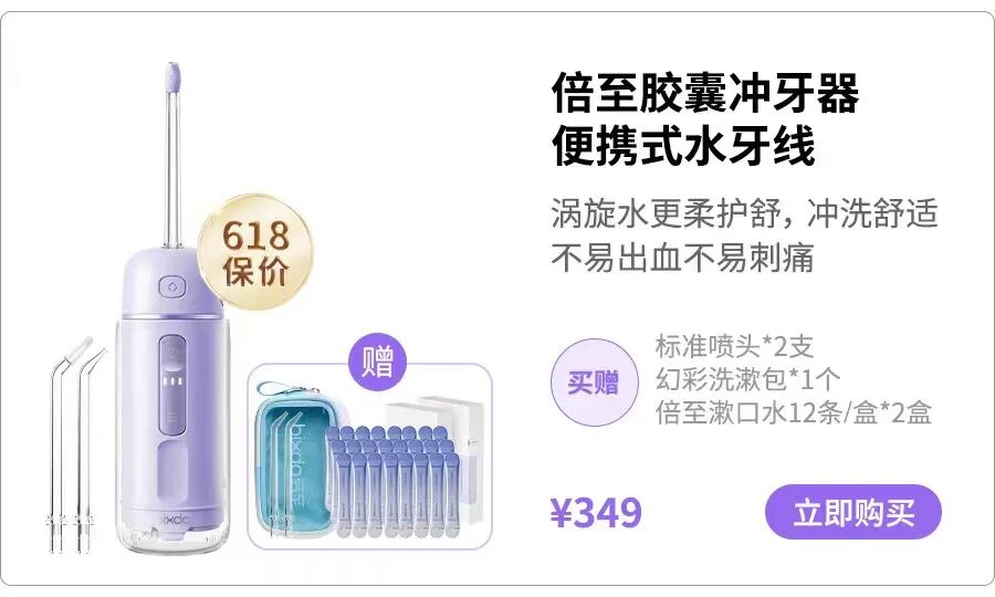 618 大促来了,正是入手冲牙器的好时机,下单即送价值 306 元的限定大礼包——洗漱包、喷头、漱口水,把你这个月的口腔清洁全承包,实在阔绰!