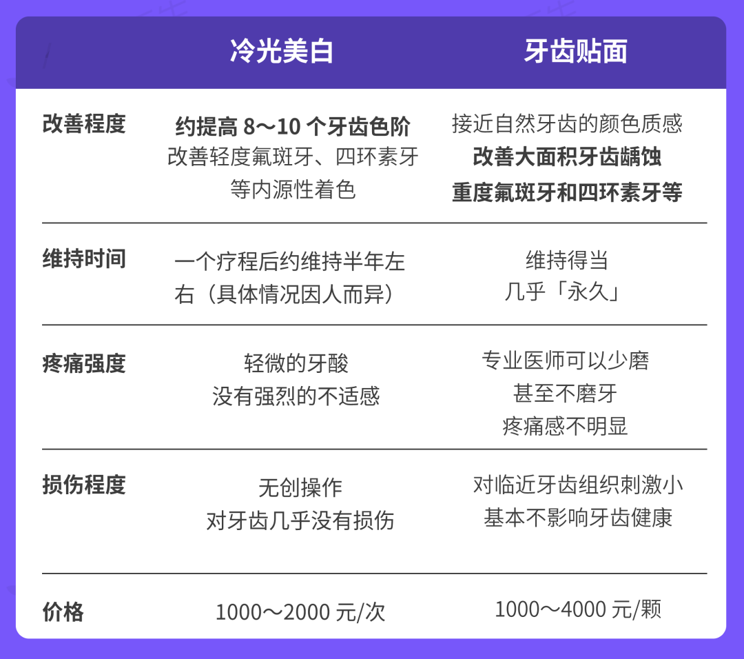 两者最大的区别之一就是,牙贴面会磨去一部分牙齿,冷光美白是作用于牙齿,不会影响牙齿自身的形态。