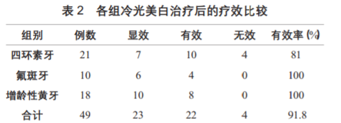 一项研究显示,针对 49 例不同牙黄情况的患者,完成了一个疗程的冷光美白治疗,经治疗后的疗效比较如下: