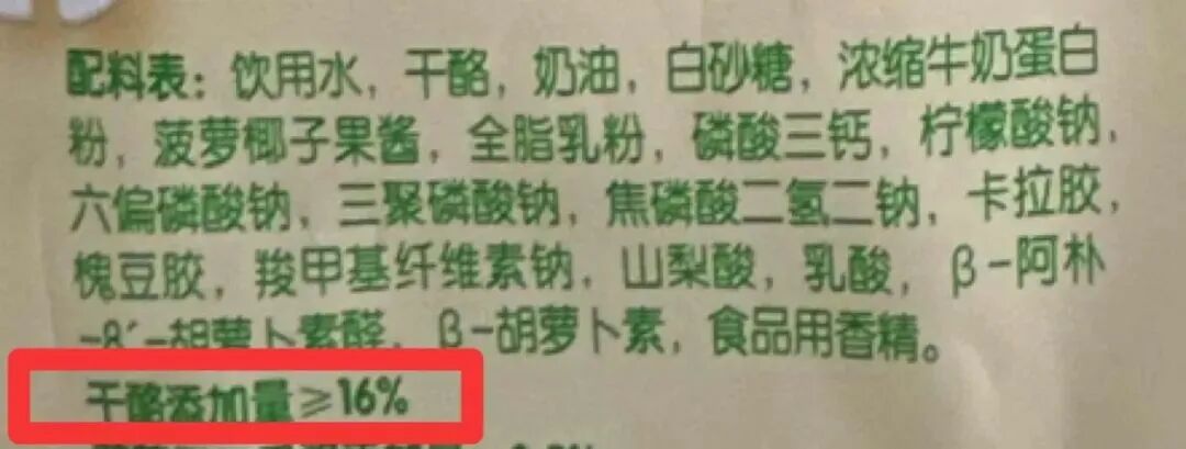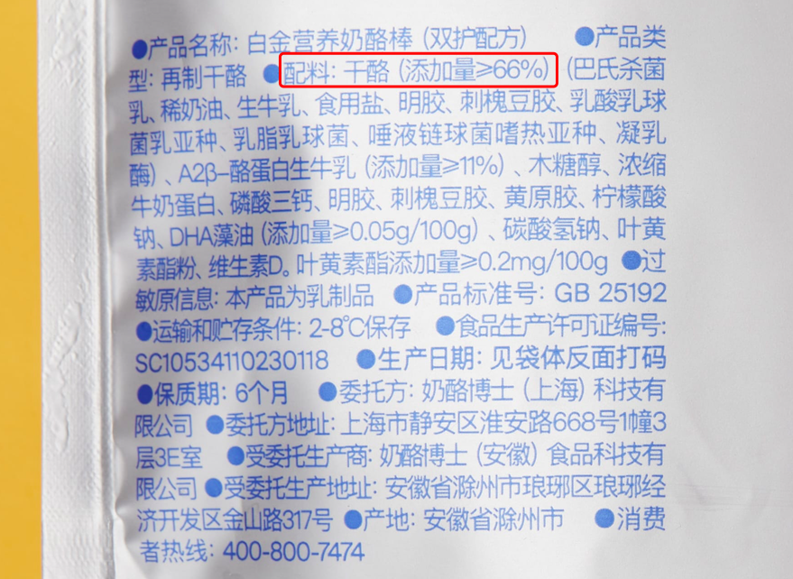 不少奶酪棒干酪添加还不足 20%。区别就是,吃奶酪添加量大于 50% 的,可以说是吃再制奶酪;但吃奶酪添加量 16% 的,只能说吃的是奶酪制品。