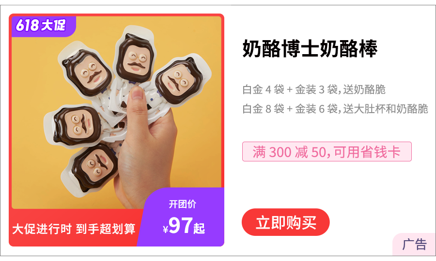 白金营养棒双护 + 双易各 10 支,金装三个口味各 5 支,共 35 支,开团价 97 元,赠送奶酪脆一袋。