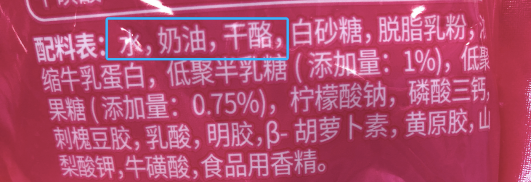 二看配料表,奶酪最好在第一位,且添加量要至少大于 50%。