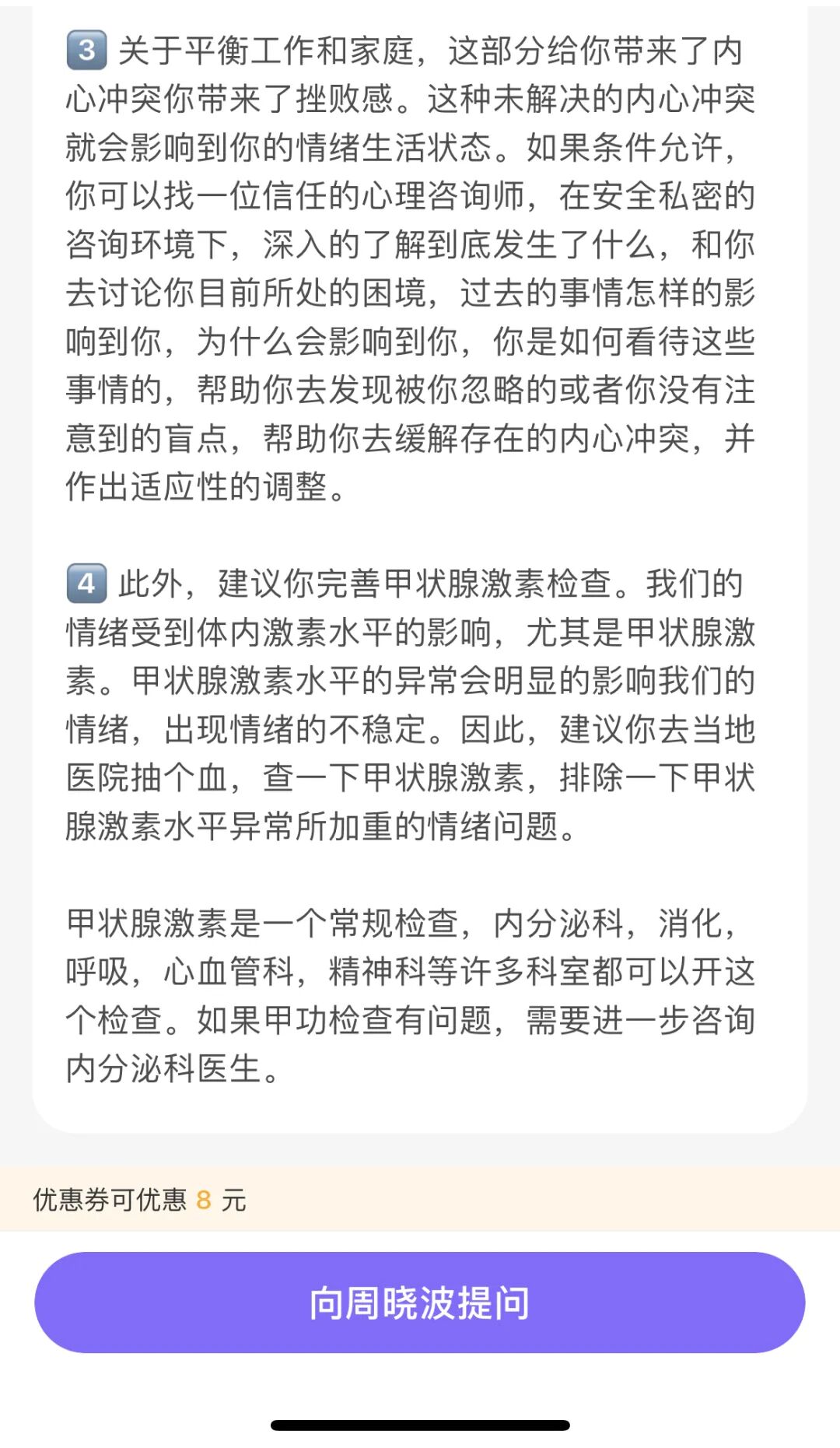 如果一时不方便,或者不确定是否有必要进行比较昂贵的线下心理咨询:可以试试线上咨询医生先进行一轮专业评估,价格也相对实惠,可以获取初步评估和建议,再进一步考虑后续是否要线下就医或者开始心理咨询。