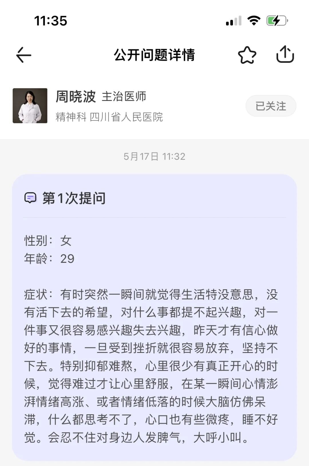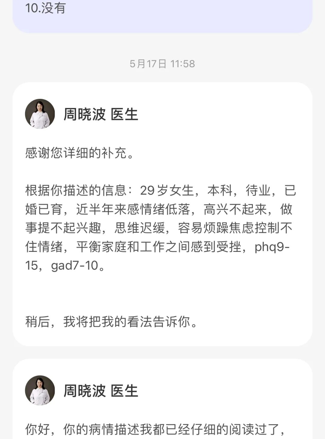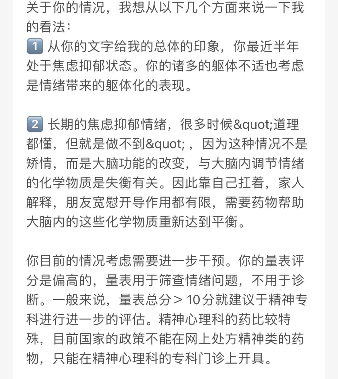 精神心理科医生为你进行在线疏导的同时,还能为你评估是否需要做进一步检查或者接受医学治疗,是否建议进行费用较为昂贵的心理咨询等。