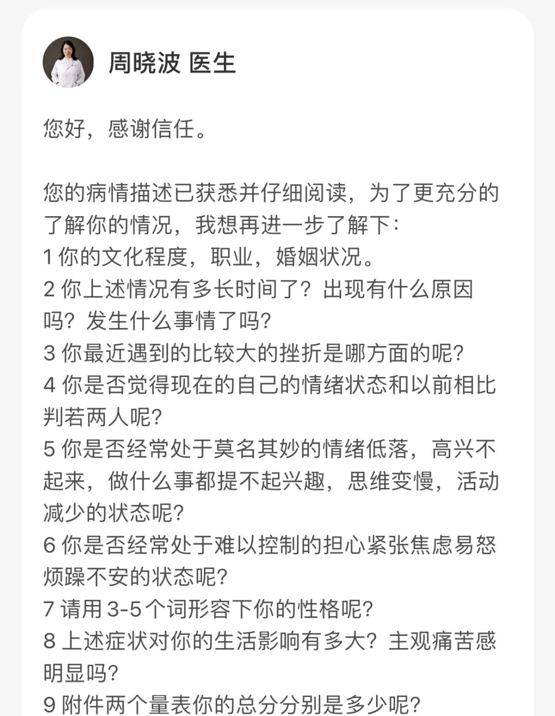 在详细了解信息后,医生可能会给出进一步就诊和检查方向的建议,对相关疾病的一些健康知识进行讲解和阐释,安抚焦急的情绪,并根据反馈结果,给出可能的药物治疗、心理治疗或其他治疗建议和指导。