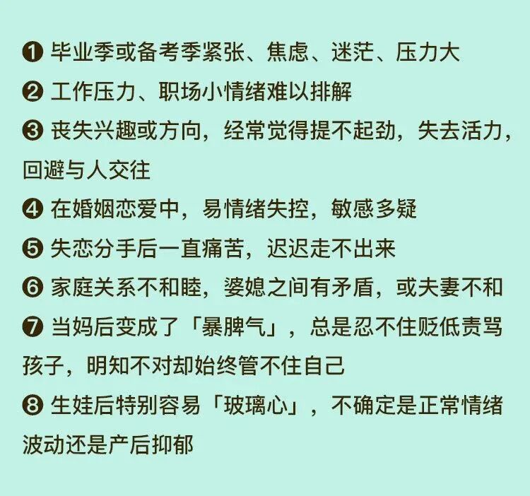 比如,学习压力、考试焦虑、晋升压力、生意受挫、恋爱受挫、婚姻危机.......它们可能导致咱们进入情绪不好、心理困惑、状态不佳、难以自拔等状态。