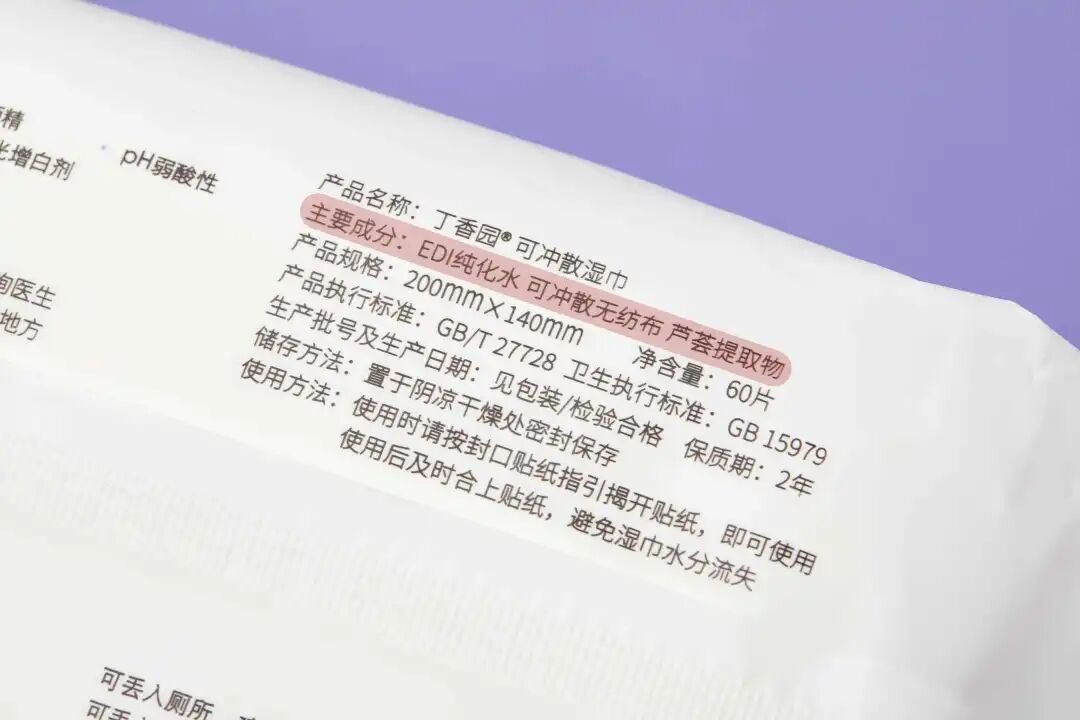 我们的湿厕纸配方非常简洁,主要成分就三个:可冲散无纺布(即木浆 + 粘胶纤维)、EDI 纯化水、芦荟提取物。