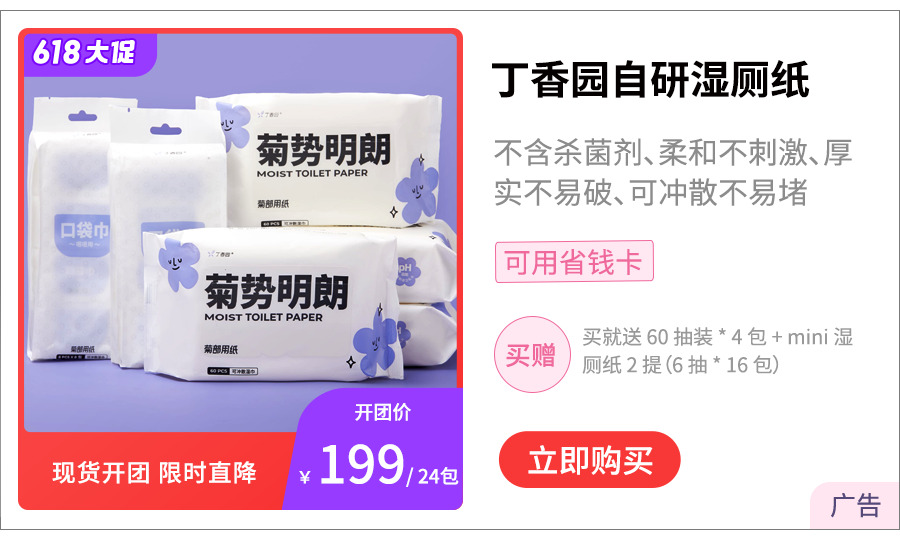 而我们这次 618 大促开团,大包装 24 包 * 60 抽湿厕纸,整箱带走仅需 199 元,只算主商品,就比平时活动价还要便宜几十块。