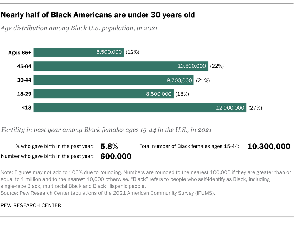 更值得注意的是,美国黑人人口非常年轻。2021年美国黑人中位年龄为33岁,白人中位年龄58岁,近一半黑人人口年龄在30岁以下。