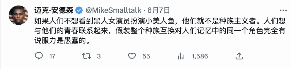 所以在北美大茧房里,美国观众很难理解为什么中国人这么不待见《小美人鱼》,思来想去,还是国内的斗争路径最熟悉——无他,种族主义。