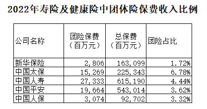 从目前的人身险市场来看,团险业务占比较少。第一财经记者统计发现,在A股五大上市险企中,团险业务在寿险及健康险业务中的保费收入占比均不超过10%,最低的新华保险仅1.72%,最高的中国太保该比例为6.78%。不过,在一些以团险业务见长的险企,通常团险所占比例会比较高,譬如承接集团团险业务的部分养老保险公司以及相互保险公司,其主要的表内保险产品基本为团险产品。