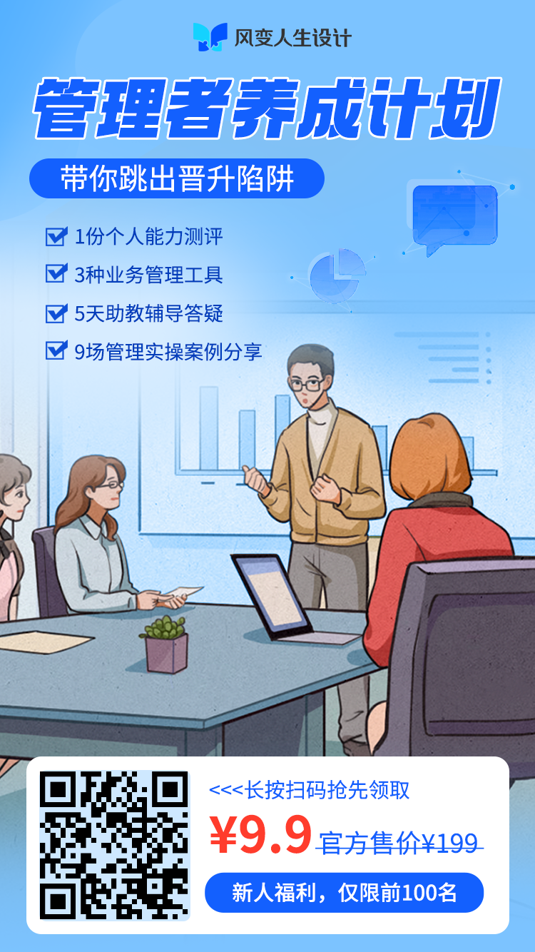 后面意识到破局只能靠我自己之后,我找了很多方法,在短时间内使我的管理能力得到大幅度提升,是因为这2点我做的很好:1、增强学习力 2、提升管理思维。学习力,让我与时俱进,而管理思维,让我帮助公司培养了一支强兵,迅速脱了“救火队长”的帽子。可几乎90%以上的新晋管理者被提拔后,都陷入了这个局面:而更残酷的是,根据职场的金字塔结构,新晋的基层管理者也会被分流:一流的管理者通过学习成为优秀管理,一路晋升中高层;而大部分人继续依靠直觉做管理,不断踩坑,结果陷入管理瓶颈,发展停滞不前。如果想快速适应角色转变,成为一名优秀的管理者,我建议你学习下MTP管理(Management Training Program )。MTP在美国、日本等世界各地都得以广泛应用,它尤其适合1-5年的管理者提升团队管理水平,从实际业务场景入手,解决普遍、难搞的日常管理问题,但这套体系早年并没在国内普及。为了弥补这个空白,在教育领域扎根近8年的风变科技,联合华为、腾讯等企业高管,历时2年研发出风变MTP管理课。今天,本公众号给大家争取到全网冰点价,官网价199元,现在扫码下单只要9.9元,只有100个名额,先到先得!4 节干货课程+ 5 天全程指导+ 10 余种高效能工具![]()