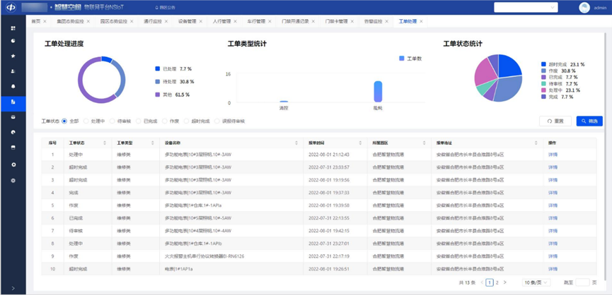 “看看这设备工单管理,园区内的工单是谁处置的,在哪儿处置的,进展如何,都能看到,各种各样的统计信息,一目了然。”