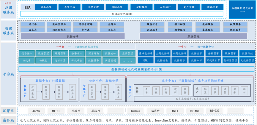 你看,在感知层和汇聚层,它已经把各种各样的设备(电器火灾、水位传感、压力传感、电表、水表、摄像头、变压器等)和协议(Modbus TCP、EA消防、MQTT、M-BUS、萤石云FLV 、阿里云FLV、Restful-API等)给封装好了。