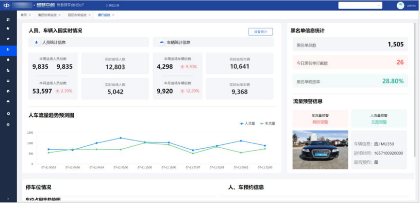 “人员车辆管理你肯定熟悉吧,对每个园区,不同入口的人员、车辆进出情况都有数据记录,可以自定义分析人车流量趋势,支持黑名单,流量预警。”