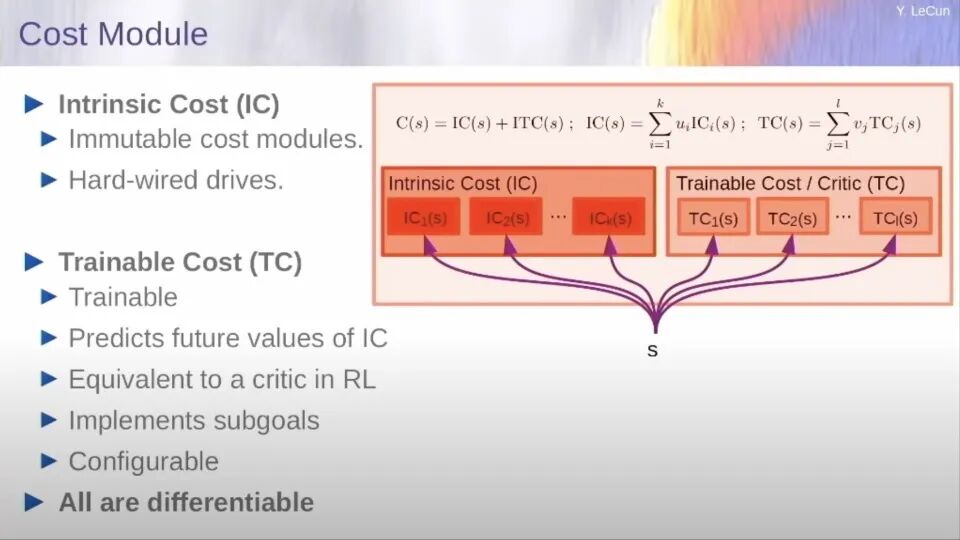 成本函数可以由两组成本模块组成,并将由系统调制以决定在任何时候完成什么任务。所以在成本中有两个子模块。有些是那种内在的成本,是硬性规定的、不可改变的。你可以想象,那些成本函数将实施安全护栏,以确保系统行为正常,不危险,无毒等等。这是这些架构的一个巨大优势,即你可以在推理的时候把成本进行优化。