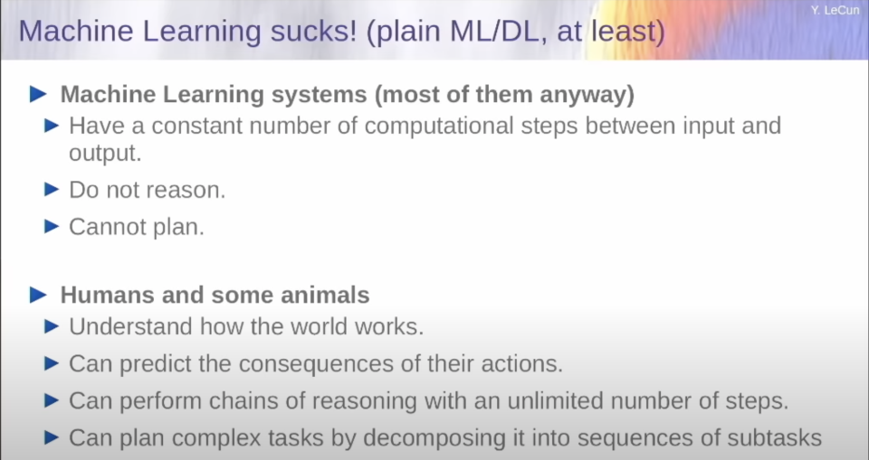 我要说的第一件事是:与人类和动物相比,机器学习不是特别好。几十年来,我们一直在使用监督式学习,这需要太多的标签。强化学习效果不错,但需要大量的训练来学习任何东西。当然,近年来,我们一直在使用大量的自我监督学习。但结果是,这些系统在某个地方不太专精,而且很脆弱,它们会犯愚蠢的错误,它们不会真正地推理,也不会计划。当然它们的反应确实非常快。而当我们与动物和人类进行比较时,动物和人类可以极其迅速地做新的任务,并理解世界是如何运作的,可以推理和计划,他们有某种程度的常识,而机器仍然没有。而这是在人工智能的早期就发现的问题。