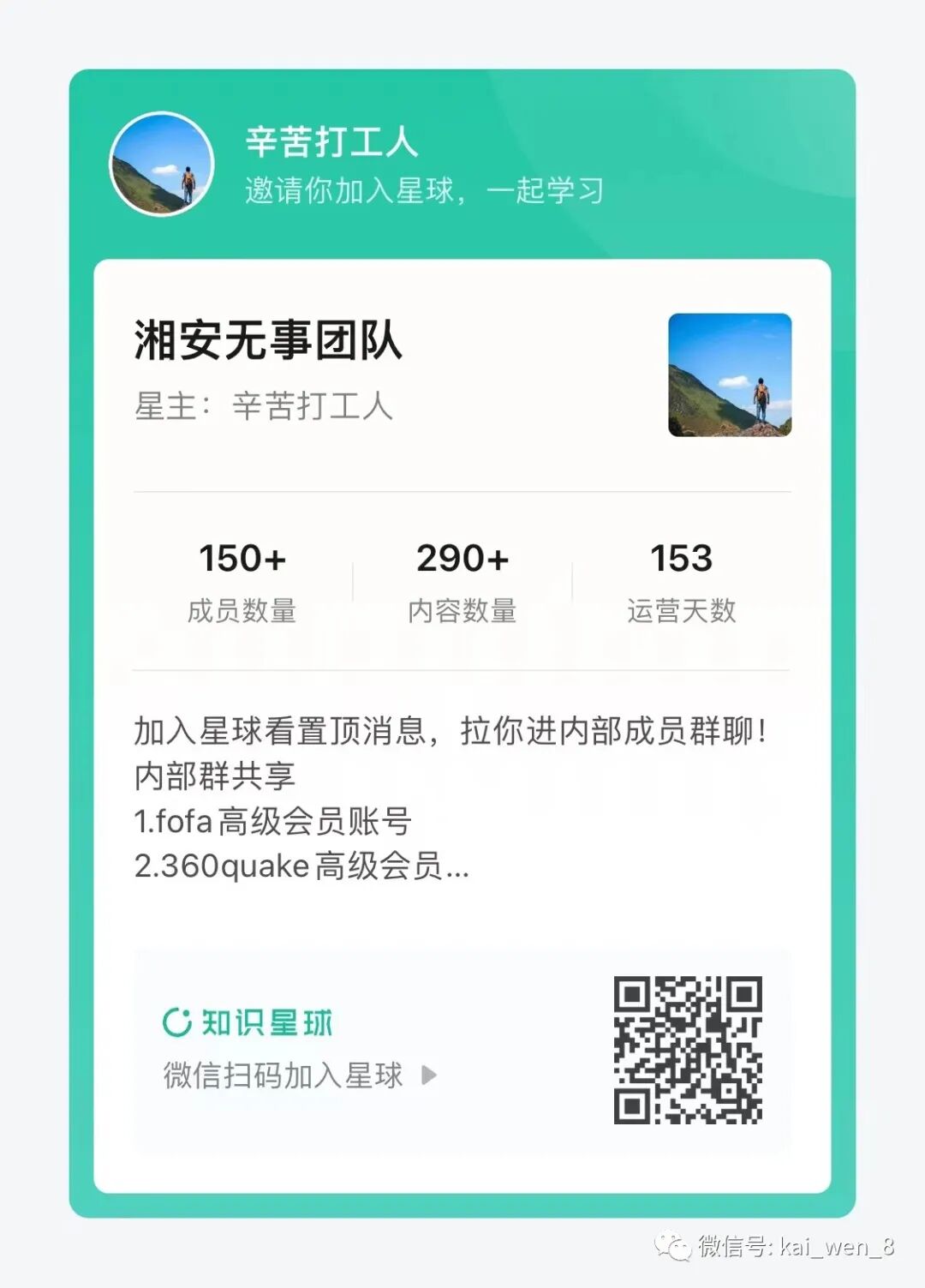 湘安无事团队 知识星球 一次付费,永久免费(付费之后会拉入内部成员群,直接免费续上)。有需要的直接添加上面微信 118永久,私我支付,直接拉内部成员群,扫码支付,三天后拉内部成员群。