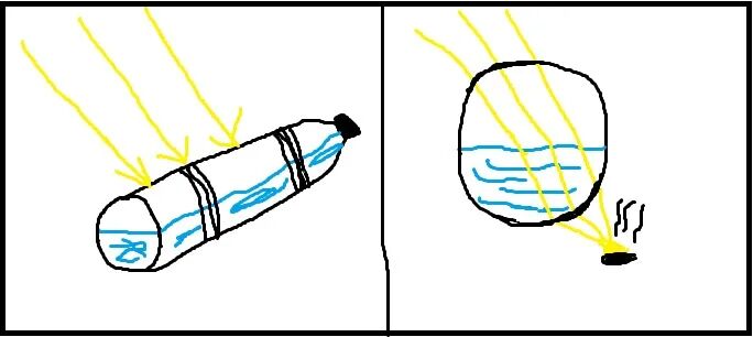 矿泉水瓶里装有水时,会形成一个凸透镜,聚光,如果阳光被持续聚到车内某一点上,温度足以引发火灾。同理,老花镜、弧形玻璃饰品等也要注意,不能放置在车内。