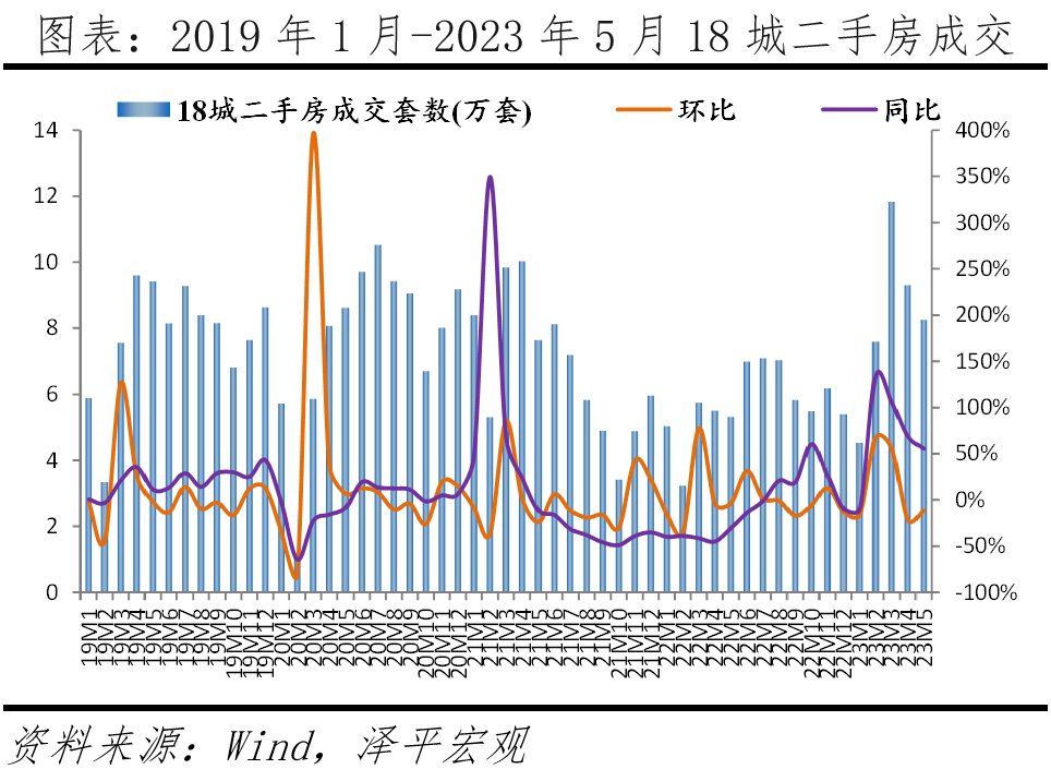 2023年4、5月,18个样本城市二手房分别成交9.3、8.3万套,环比持续下滑,不及2019~2022年二手房成交表现;同比延续之前的增长态势,但较3月涨幅明显收窄。