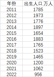 另一方面,更为重要的是,从出生人口数量来看,近年来,我国出生人口持续下降。2019年出生人口跌破1500万,2020年降至1200万,2021年仅为1062万。2022年首次跌破1000万,仅为956万,仅为2016年的50.8%,也就是说,7年来我国出生人口下降了49.2%。