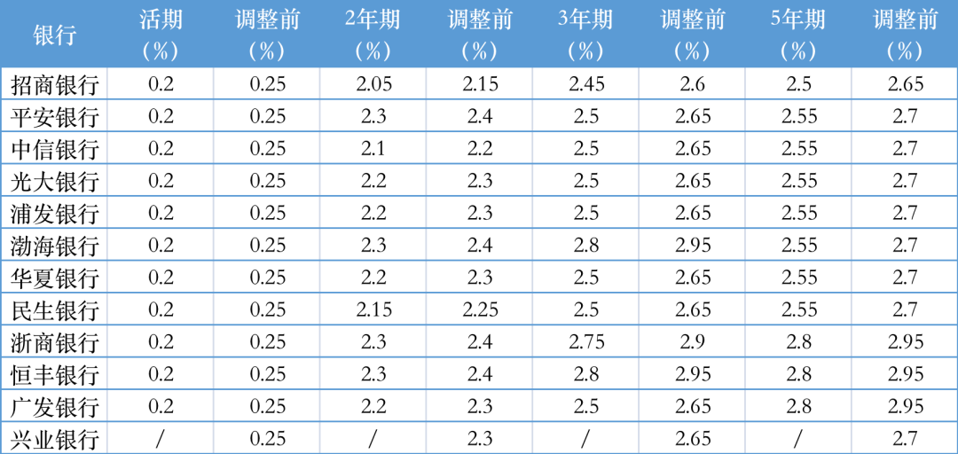 6月12日起,多家股份行跟进大行调整多个存款品种利率,调整幅度与大行一致,即活期存款挂牌利率下调5个基点;两年期定存下调10个基点;三年期、五年期定存均下调15个基点。