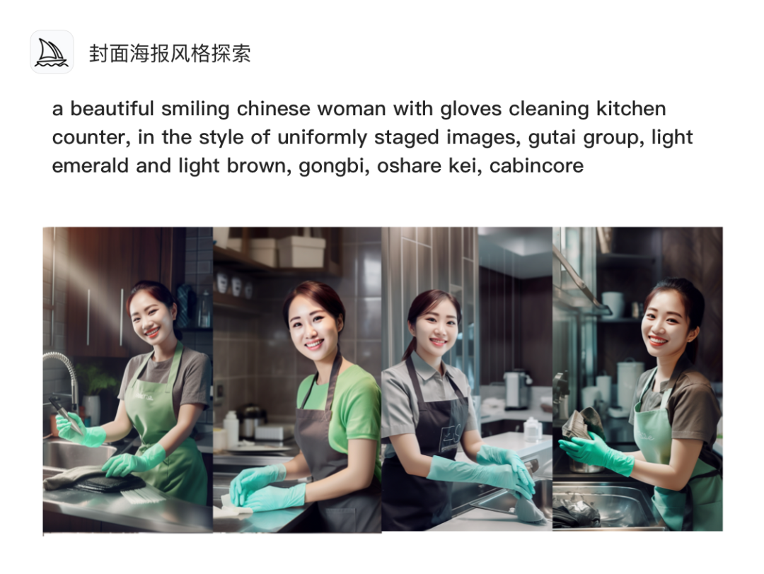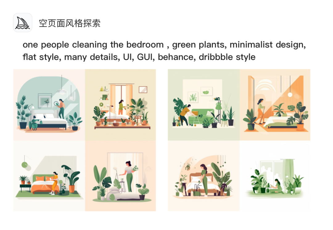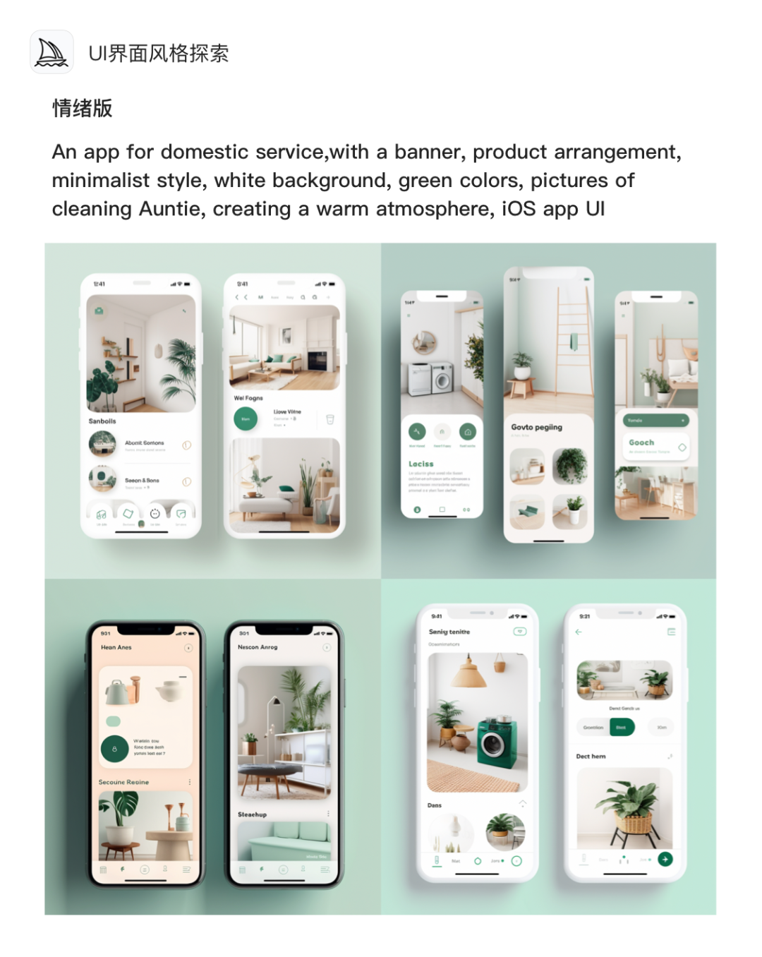 在UI设计中,当遇到新的风格改版时候,首先是确定设计的方向,产品风格,为后续的产品方向制定基调。也是设计师们常用的情绪版设计。利用midjourney。以58到家家政类APP为例,通过前期用户分析得出用户更注重生活品质,喜欢清晰、简洁、易用的页面,通过输入关键词来输出大量的情绪板。可以控制风格更倾向于用户的审美基调。控制颜色更贴近品牌的表达。