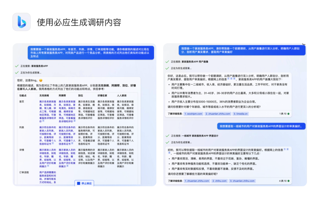 NewBing,是微软刚推出的一款基于人工智能的聊天机器人。使用NewBing做一个家政类APP的竞品分析。通过提出问题得到同类型产品竞品分析,在提问时可以尝试用表格进行列举这样对比更清晰。并且从用户画像的角度为你分析用户的审美偏好,为前期视觉调性的设计定义大致的方向。如通过分析得知家政类的用户更注重生活品质,喜欢清晰、简洁、易用的页面。