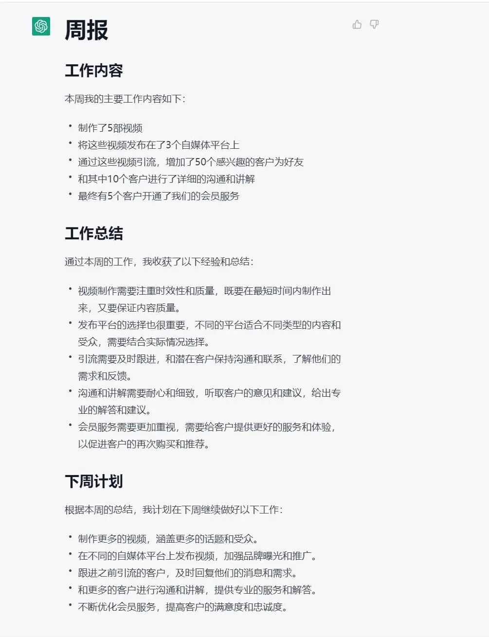更鸡贼的是,连周报、月报,她都用 ChatGPT 实现了自动代写,只要你给到合适“咒语”,分分钟就能帮你分成一份 高大上 的周报,日报。