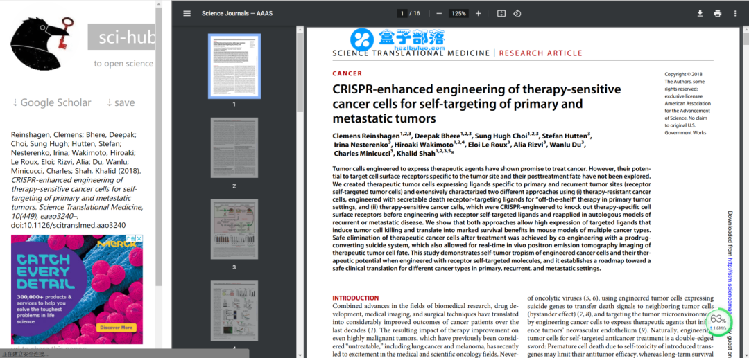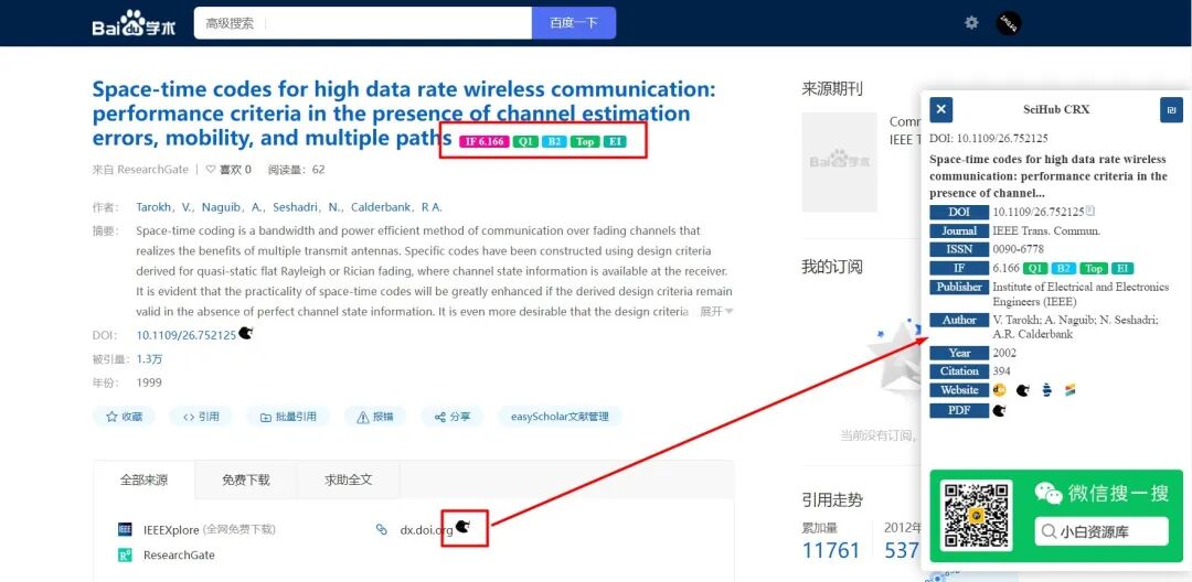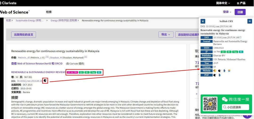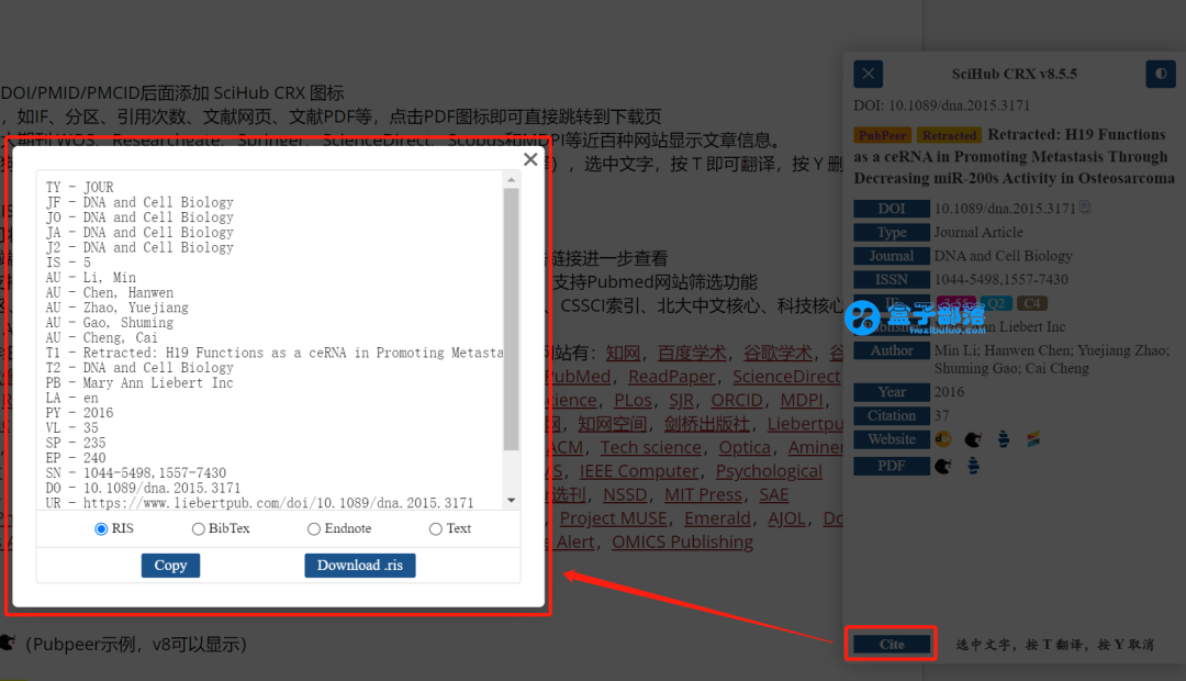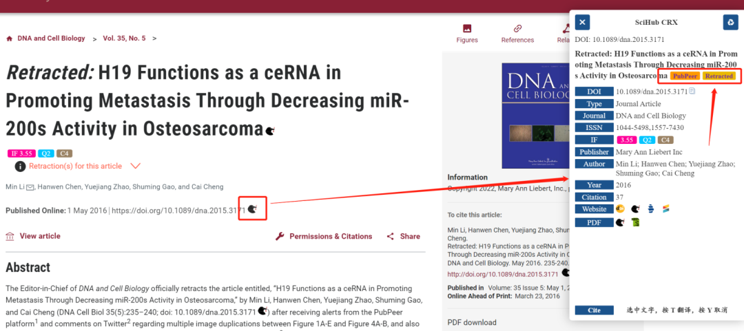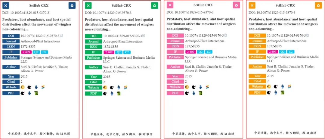 【SciHub CRX】 超级好用的SCI文献信息获取助手,完美支持 Sci-Hub、Libgen、unpaywall、OA Button、Pubmed 等数据库,访问文献网页时,会在文献DOI/PMID/PMCID后面添加 SciHub CRX 图标,点击图标可获取详细文章信息,如IF、分区、引用次数、文章PDF等,点击PDF图标可跳转到下载页,完美支持知网,百度学术,谷歌学术(镜像),Scopus,WOS,Springer,IEEE,PubMed,ReadPaper,ScienceDirect 等上百个学术期刊网站显示期刊详细等级信息(如收录数据库、JCR/中科院分区、IF等),支持通过 PubPeer 检测学术不端行为,支持文章引用下载功能(支持RIS/BibText/Endnote等),点击谷歌学术链接时,自动替换为谷歌学术镜像网址,支持网页谷歌翻译功能,选中文字按 T 翻译,按 Y 删除翻译(快捷键可更换)。感兴趣的小伙伴,也可以点击下载 SciHub Pro 9 软件版本,使用下载更加方便!
