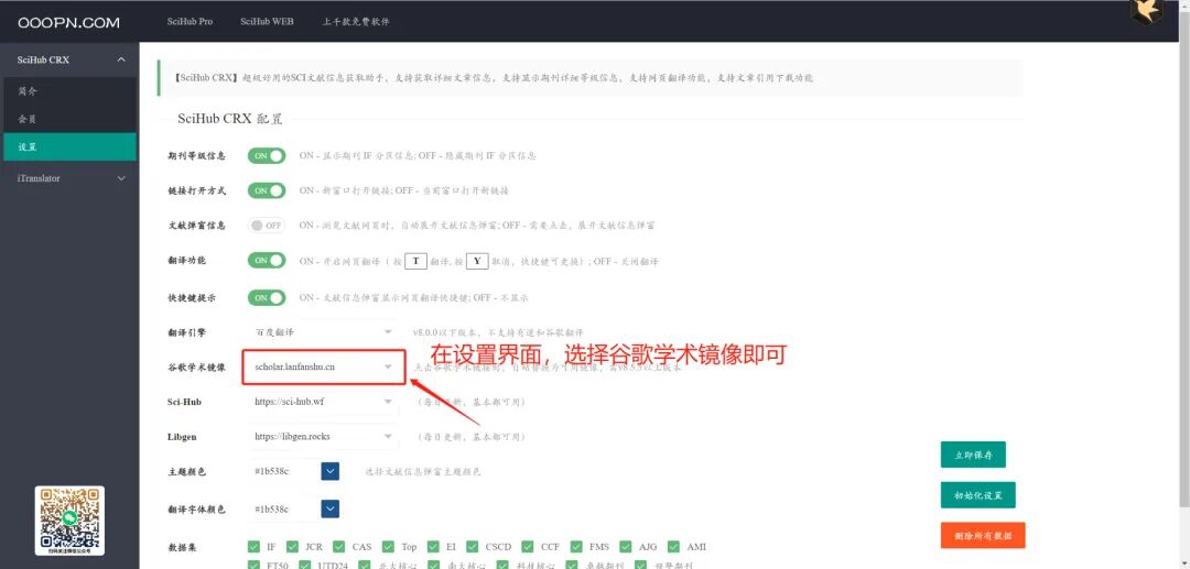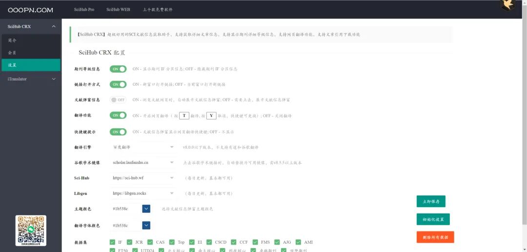 插件设置,可以选择 显示期刊等级信息、翻译功能、翻译引擎、翻译快捷键、Sci-Hub 网址、Libgen 网址、新网页打开方式以及主题颜色、翻译字体颜色、自定义数据集显示顺序等