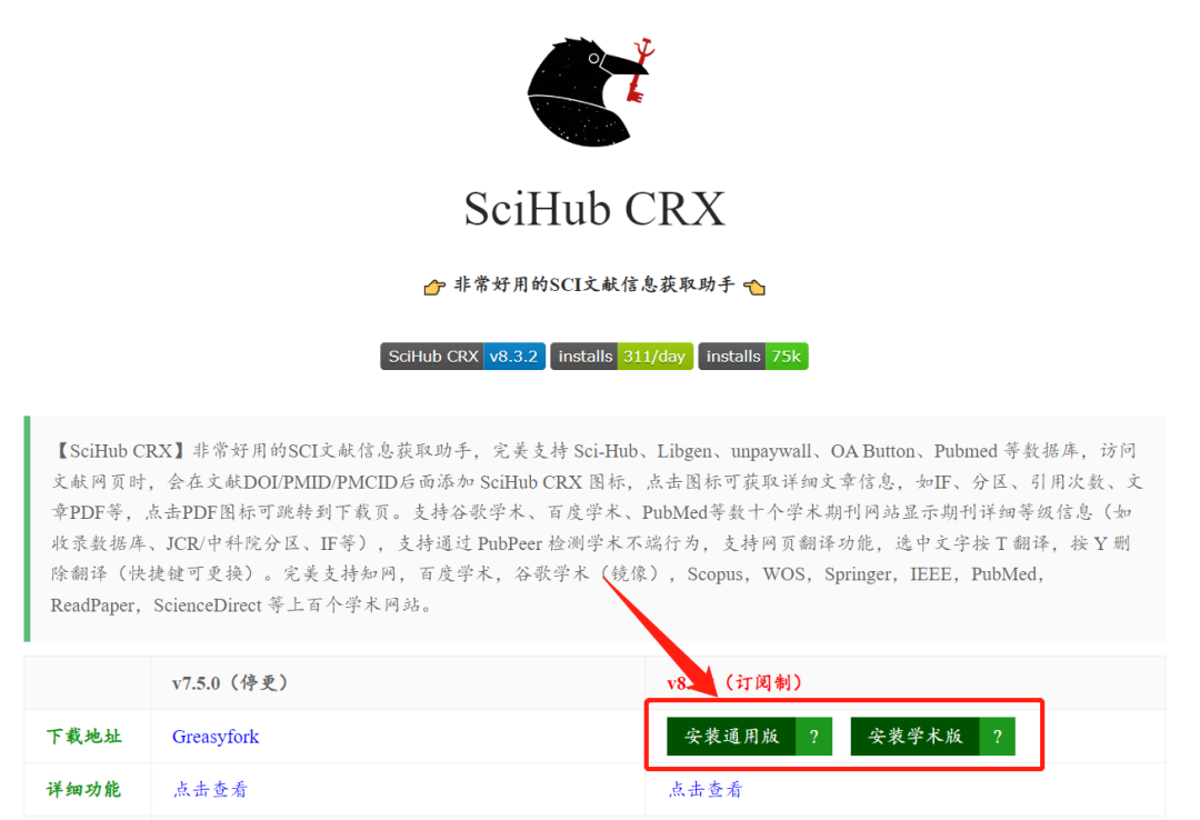 首次使用点击安装即可,通用版和学术版(两者功能一样,通用版可检测所有网站上的DOI,学术版仅可检测学术网站上的DOI)