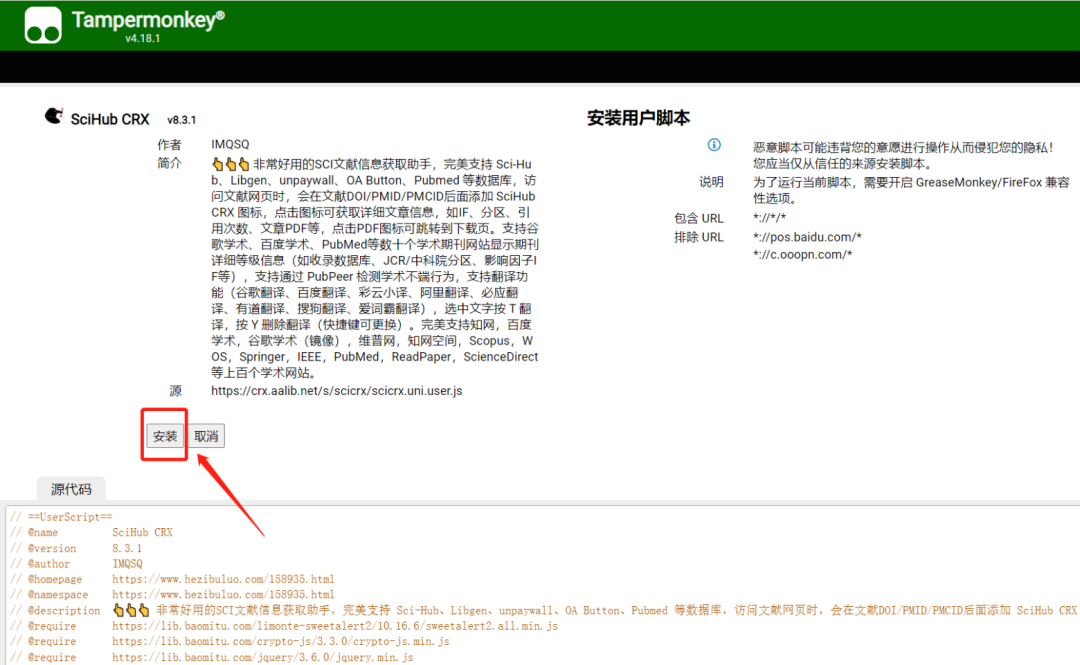 等待脚本加载后,选择安装即可(点击后会出现一片空白,代表安装成功)