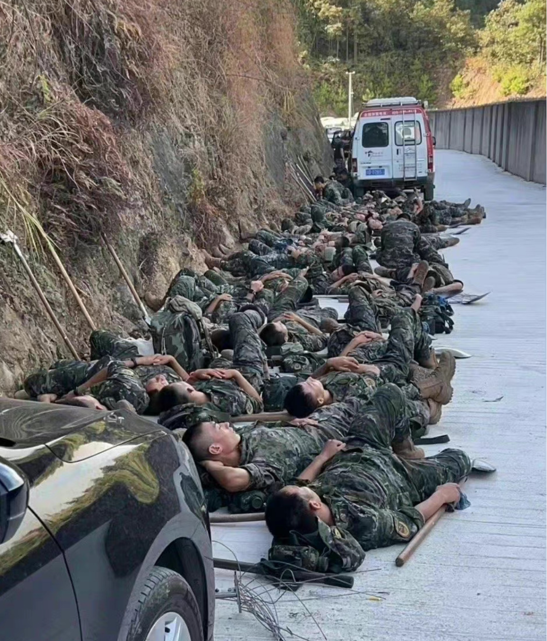 在和山火连续作战十几个小时后,消防员们直接睡在滚烫的地面上。