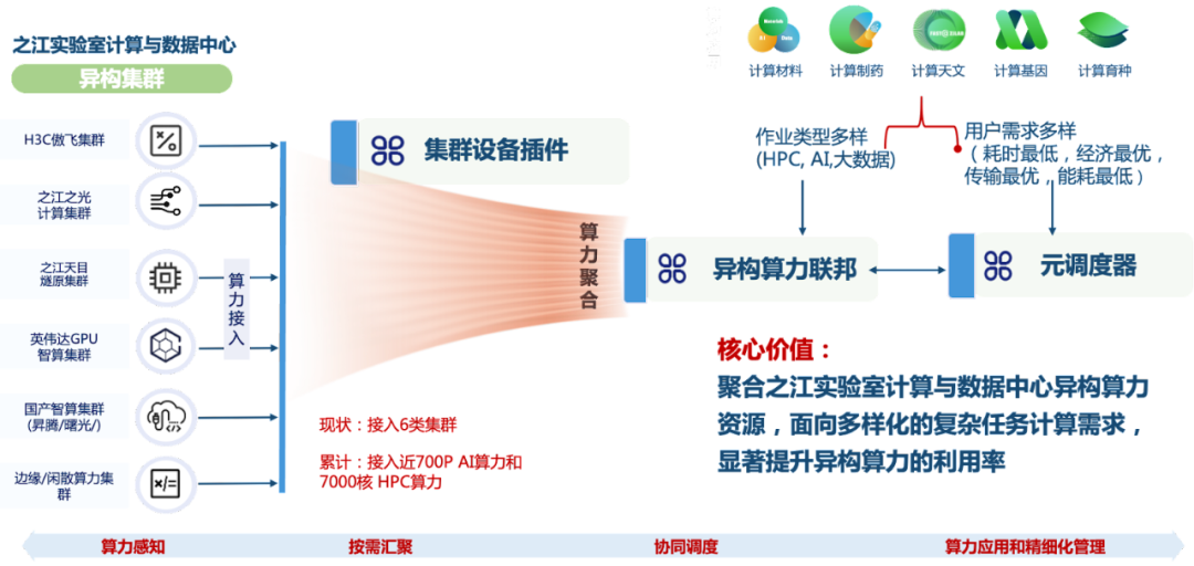 其次,我们实现了一个异构资源聚合方案。在之江实验室,我们拥有多个异构集群,包括 CPU 集群、GPU 集群以及一些超算资源。这些不同类型的计算资源具有不同的使用方式。通过异构资源聚合方案,我们将这些不同的计算资源统一聚合,实现统一的管理和使用。