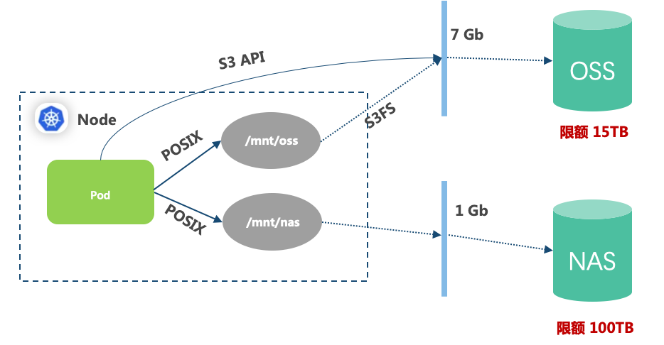 这个方案存在一个较大的问题,即直接使用裸露的对象存储性能非常差。另外,裸露使用对象存储的 S3FS 挂载点经常会出现莫名其妙的丢失。一旦挂载点丢失,容器将无法访问,如果要恢复挂载点,必须对整个容器进行重启,这对用户业务造成了很大的干扰。
