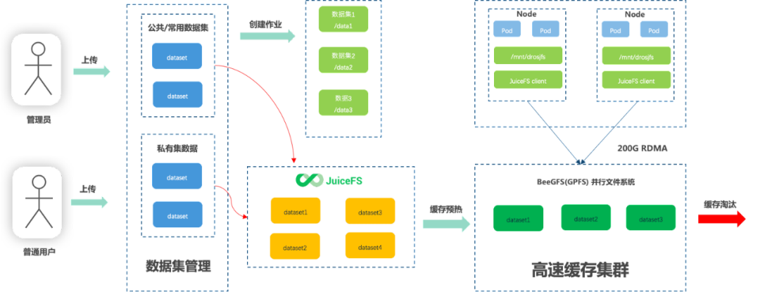 在使用 JuiceFS 时,我们还实现了一个数据编排功能。管理员可以将常用的数据集上传到文件系统某个目录,这个目录可以在上层抽象成一个公开的数据集。不同用户在创建作业时都可以挂载这些数据集。普通用户也可以上传自己的私有数据集,并通过 JuiceFS 的预热功能对这些数据集进行预热。