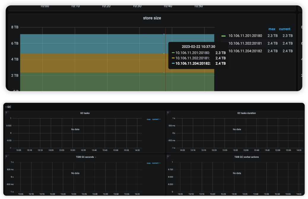 根据官方文档的显示,例如 Redis,大约 1 亿个文件应该只占用大约 30GB 的容量。我们进行了排查后发现可能是 TiKV 的元数据引擎没有进行垃圾回收。我们还查看了报表,发现整个垃圾回收指标为空。可能的原因是我们只部署了 TiKV,而没有部署 TiDB。然而,TiKV 的垃圾回收实际上需要依赖 TiDB,这是一个容易被忽视的问题点。