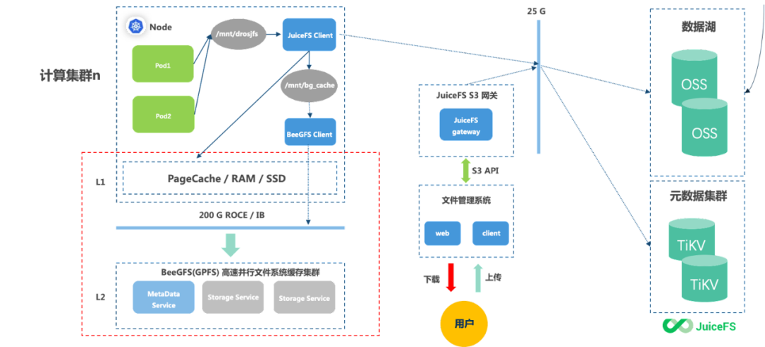 为了实现高效的数据流转,我们通过文件管理系统允许用户进行文件的上传和下载操作。文件管理系统底层采用 JuiceFS S3 网关,将数据写入底层存储。