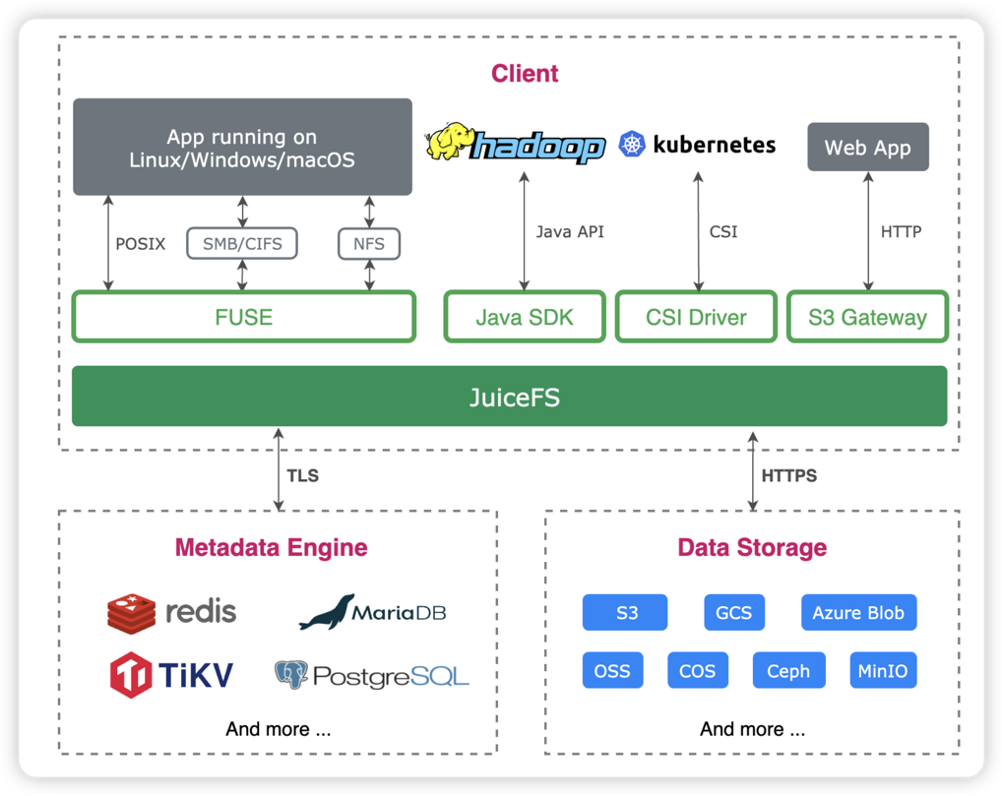 首先:存储层的抽象和统一。因为在许多计算场景中,包括超算和 AI 训练,都使用 POSIX 接口。因此,我们希望在这一层面上统一使用 JuiceFS 的接口来提供服务。