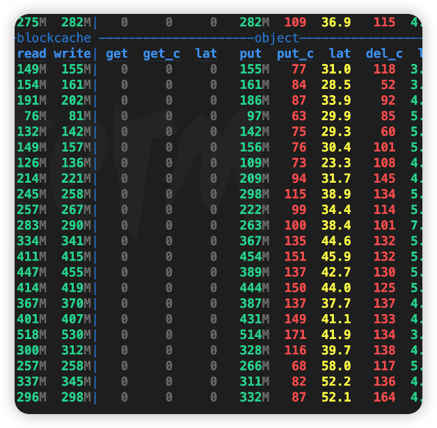 在测试小文件随机 I/O 时,我们觉得表现还可以,但在测试顺序 I/O 时,出现了一个较大的问题。例如,使用 dd 命令创建一个 500MB 的文件,结果发现对象存储生成了大量快照。可以看出,这里的存储和对对象存储的操作远远超过了创建一个 500MB 文件应有的操作。