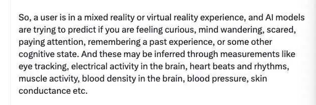 “最酷的结果之一是会用户实际行动之前预测用户会点击某些东西。这是一项艰巨的工作,也是我引以为豪的事情。你的瞳孔在你点击之前会做出反应,部分原因是你自己会预测在你点击之后发生的事情。因此,苹果可以通过监视用户的眼睛行为,并实时重新设计 UI 以创建更多这种预期的瞳孔反应,从而创建用户大脑的生物反馈。这是一个通过眼睛进行的粗糙的脑机接口,但非常酷。”