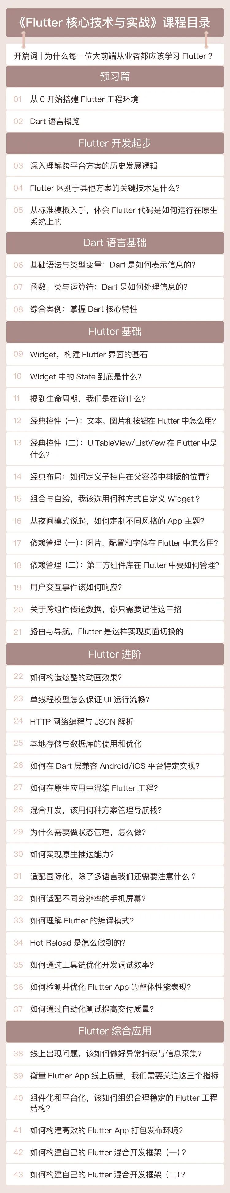 希望通过这个课程,能够帮助大家快速上手 Flutter 开发应用,掌握其精髓,并建立属于自己的终端知识体系。