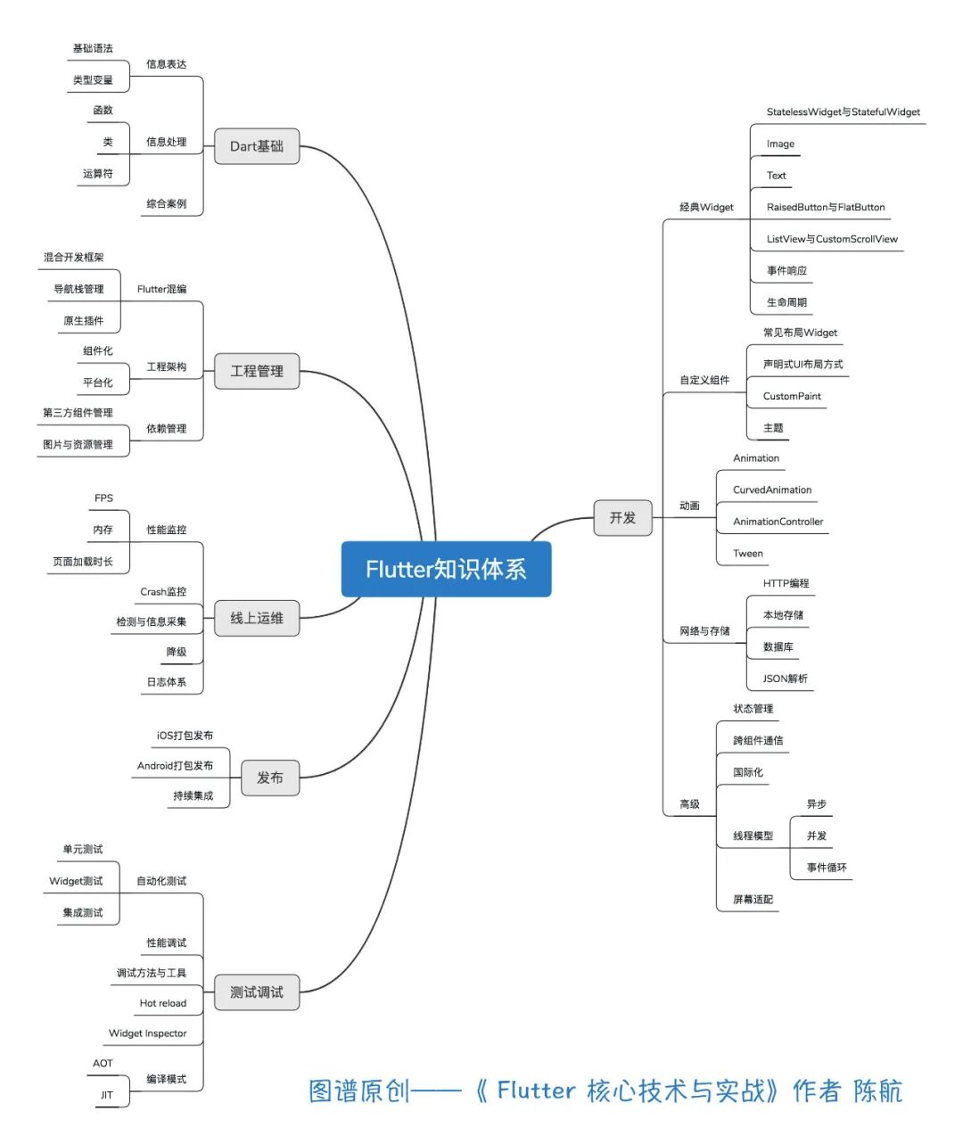 分享一张小前珍藏许久的 Flutter 核心知识图谱,里面涵盖了开发、调试、测试、发布、线上运维及工程管理。只要你能掌握下面 80% 的知识点,绝对可以搞懂 Flutter。